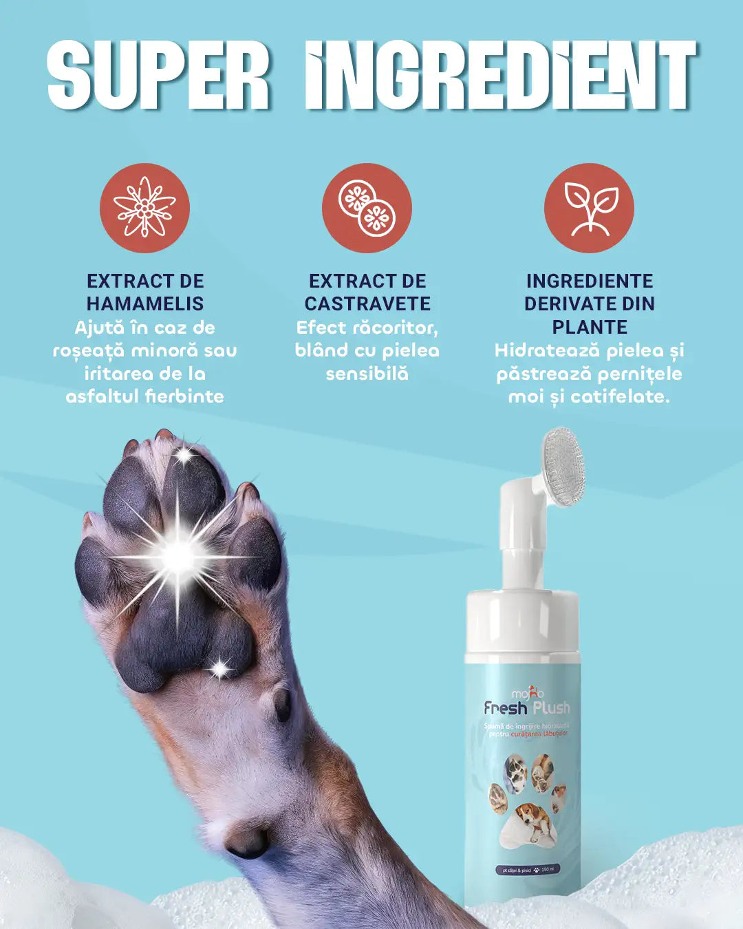 Spuma de îngrijire hidratează pernițele și curăță blănița, îndepărtează microbii dintre degete și dezinfectează. O poți folosi și pentru alte părți ale corpului. Recomandată pentru cuțu și pisi, chiar dacă își ling lăbuțele (Nu conține substanțe agresive).